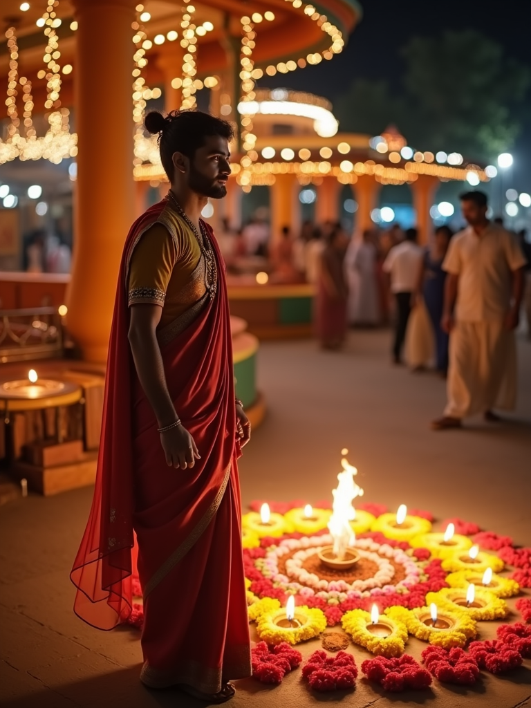 A model wearing a traditional Indian outfit like a sari or kurta, standing beside a rangoli made of colorful flowers and lit diyas, with a festive backdrop.
