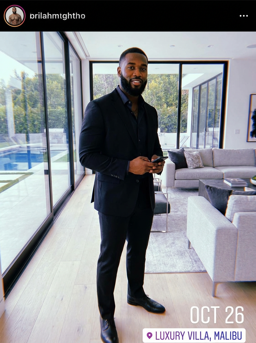 a model wearing black suit in modern luxury design villa living room, instagram photo, instagram, fit body