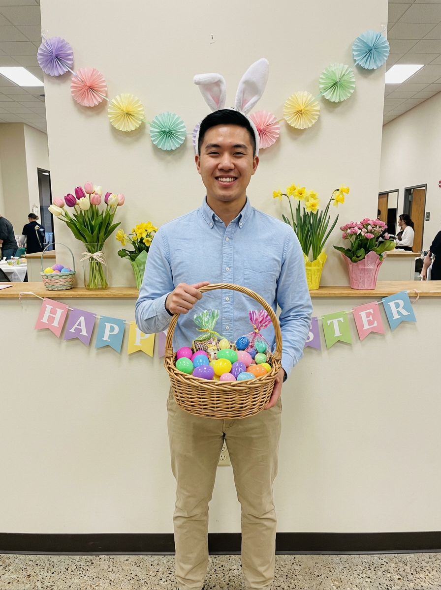 A model wearing bunny ears and posing together with their Easter baskets in front of a festive backdrop filled with spring flowers and pastel decorations.