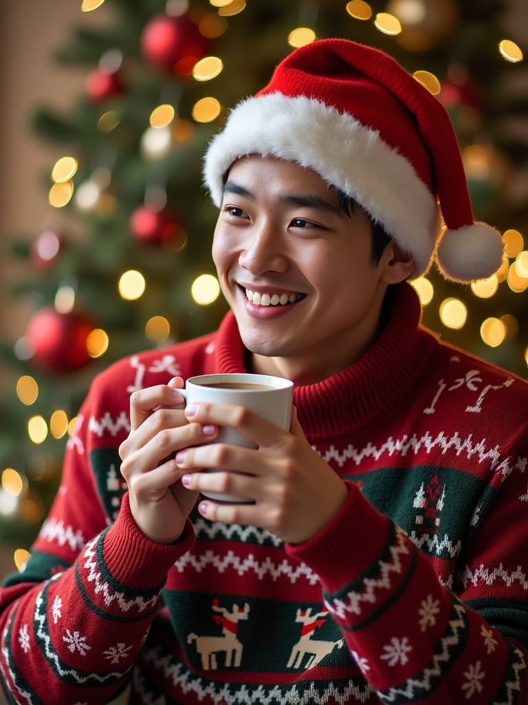 A model wearing Christmas sweaters and Santa hats, enjoying hot cocoa in front of a decorated Christmas tree.