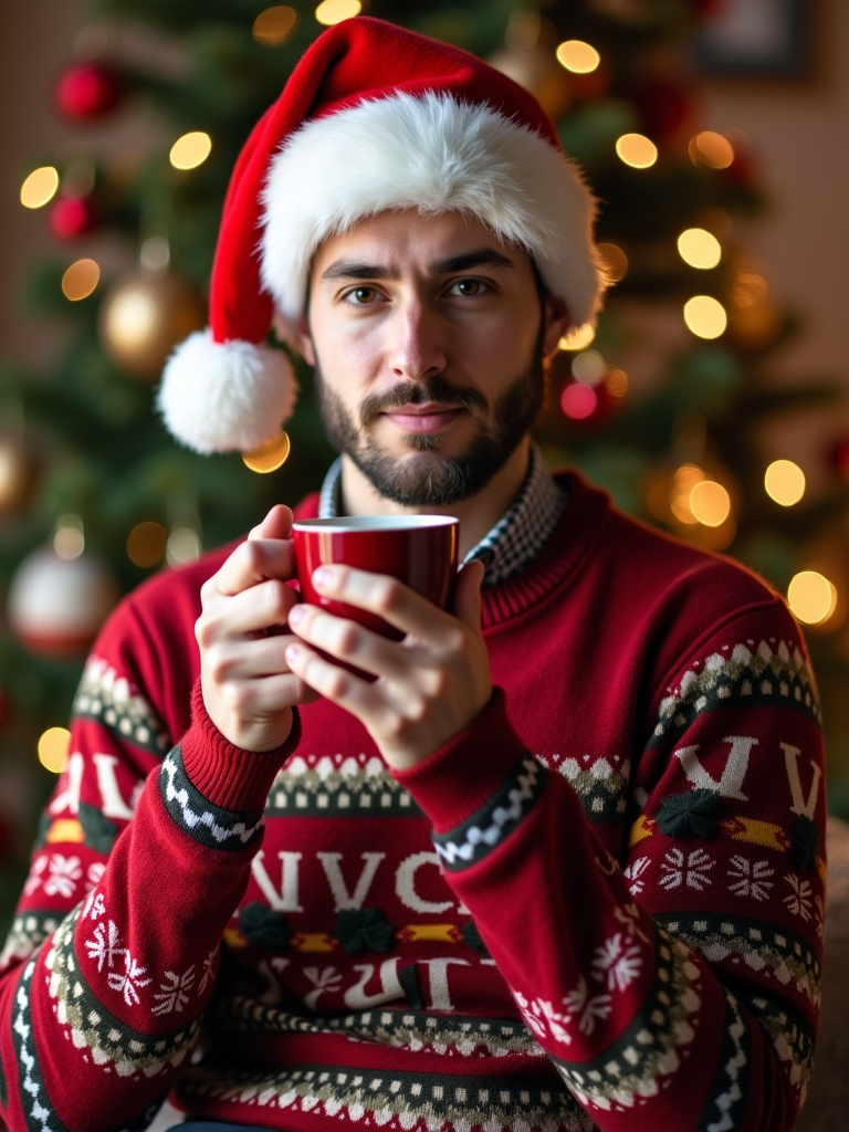 A model wearing Christmas sweaters and Santa hats, enjoying hot cocoa in front of a decorated Christmas tree.