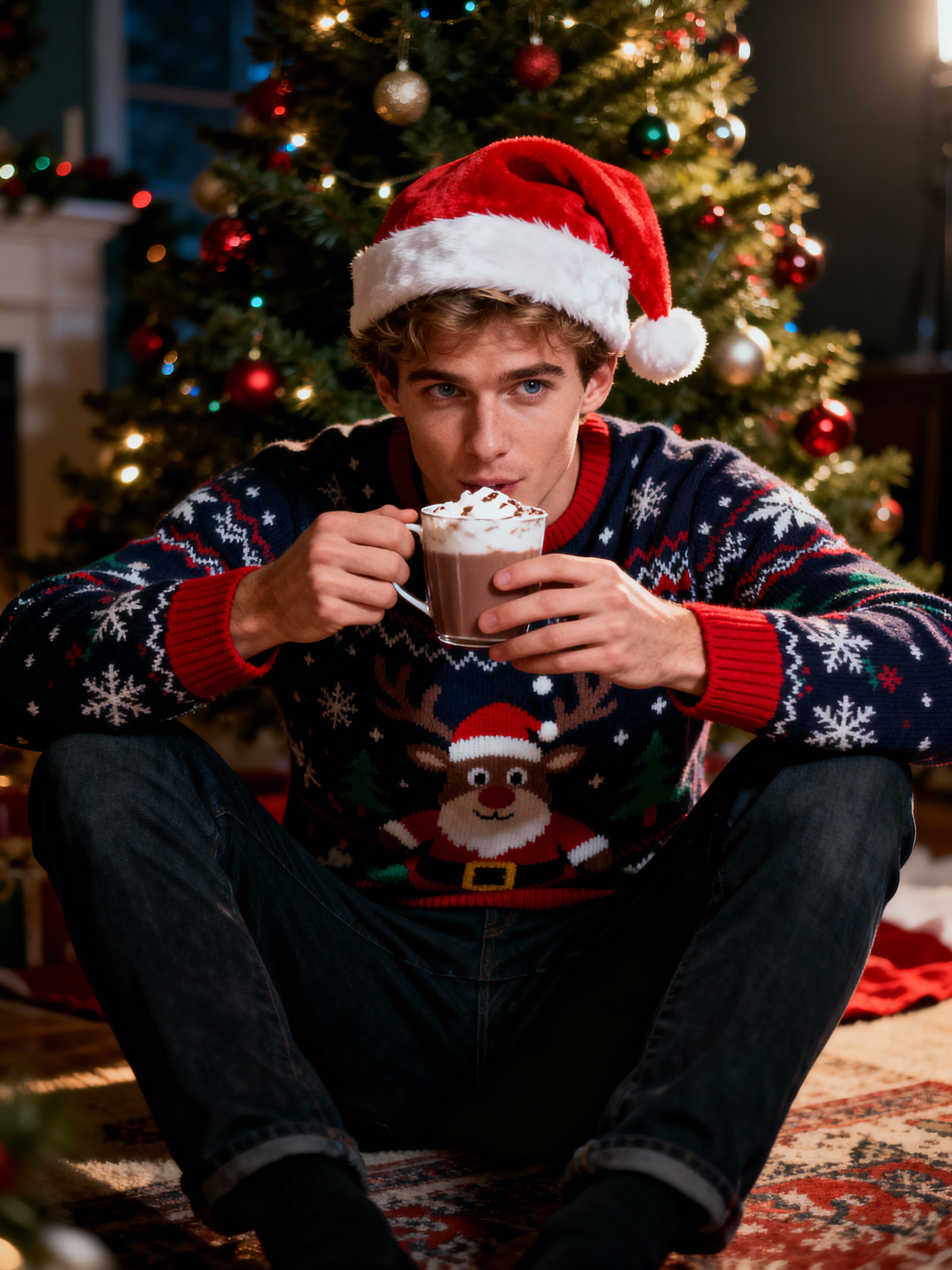 A model wearing Christmas sweaters and Santa hats, enjoying hot cocoa in front of a decorated Christmas tree.