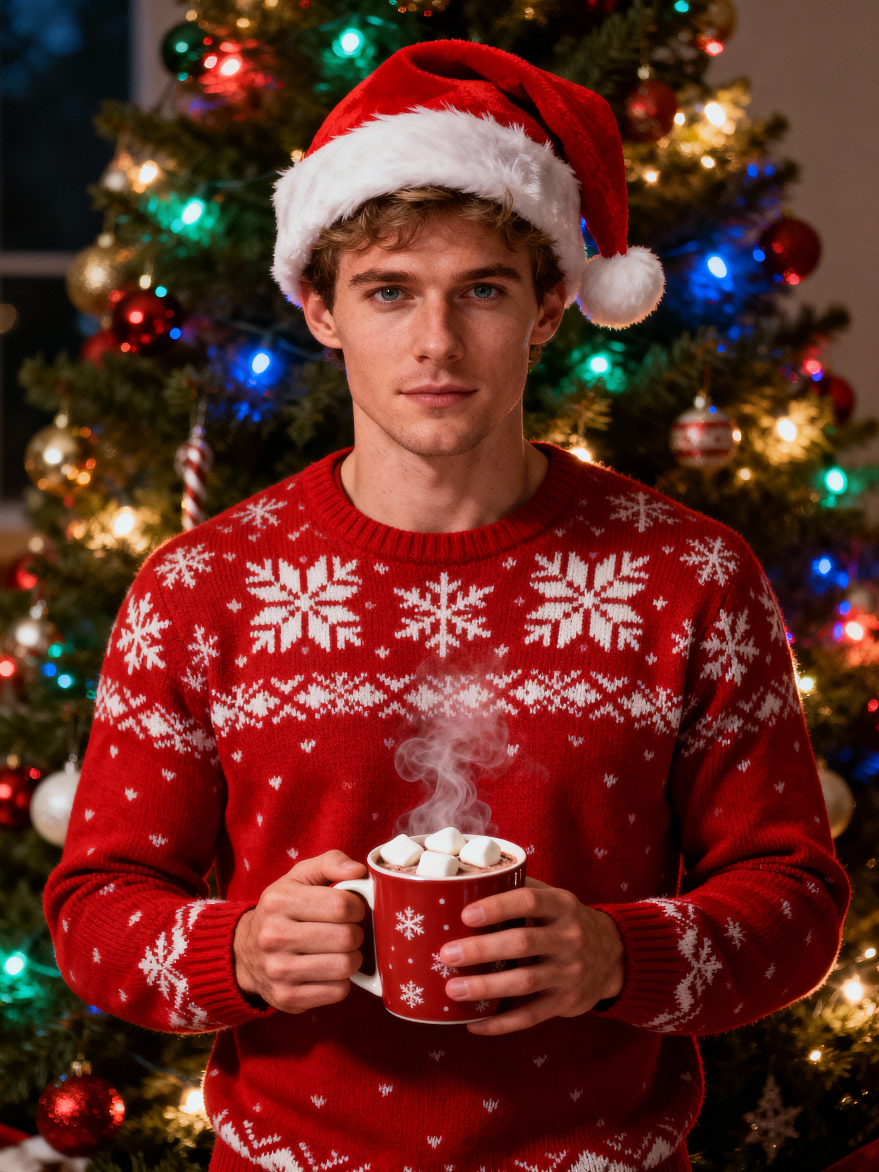 A model wearing Christmas sweaters and Santa hats, enjoying hot cocoa in front of a decorated Christmas tree.