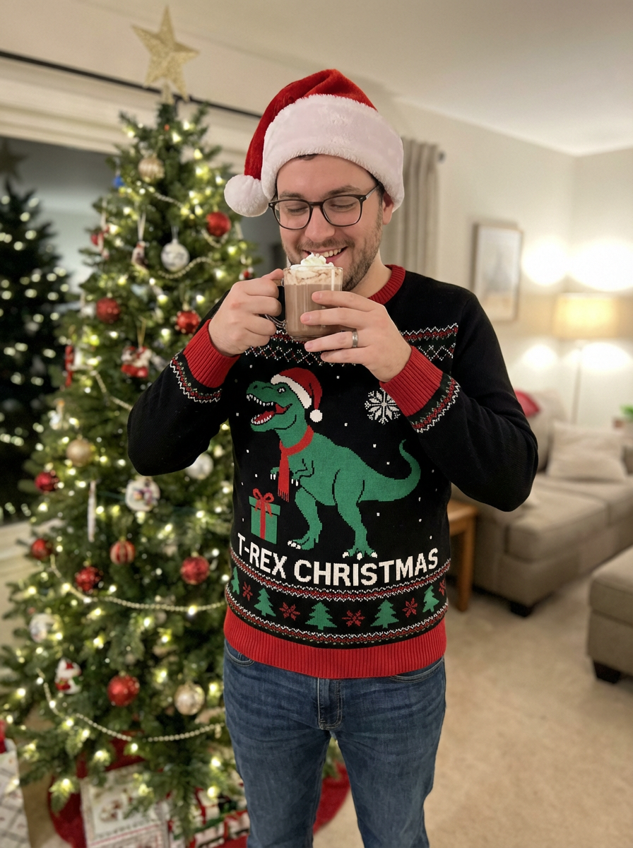 A model wearing Christmas sweaters and Santa hats, enjoying hot cocoa in front of a decorated Christmas tree.