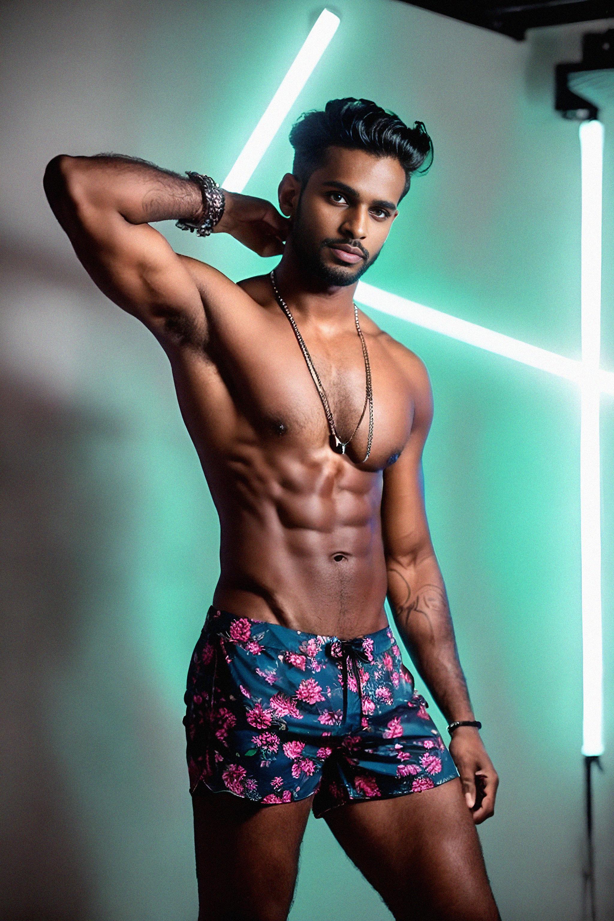 a model wearing silk floral swim shorts in night club, instagram photo, instagram, , fit body