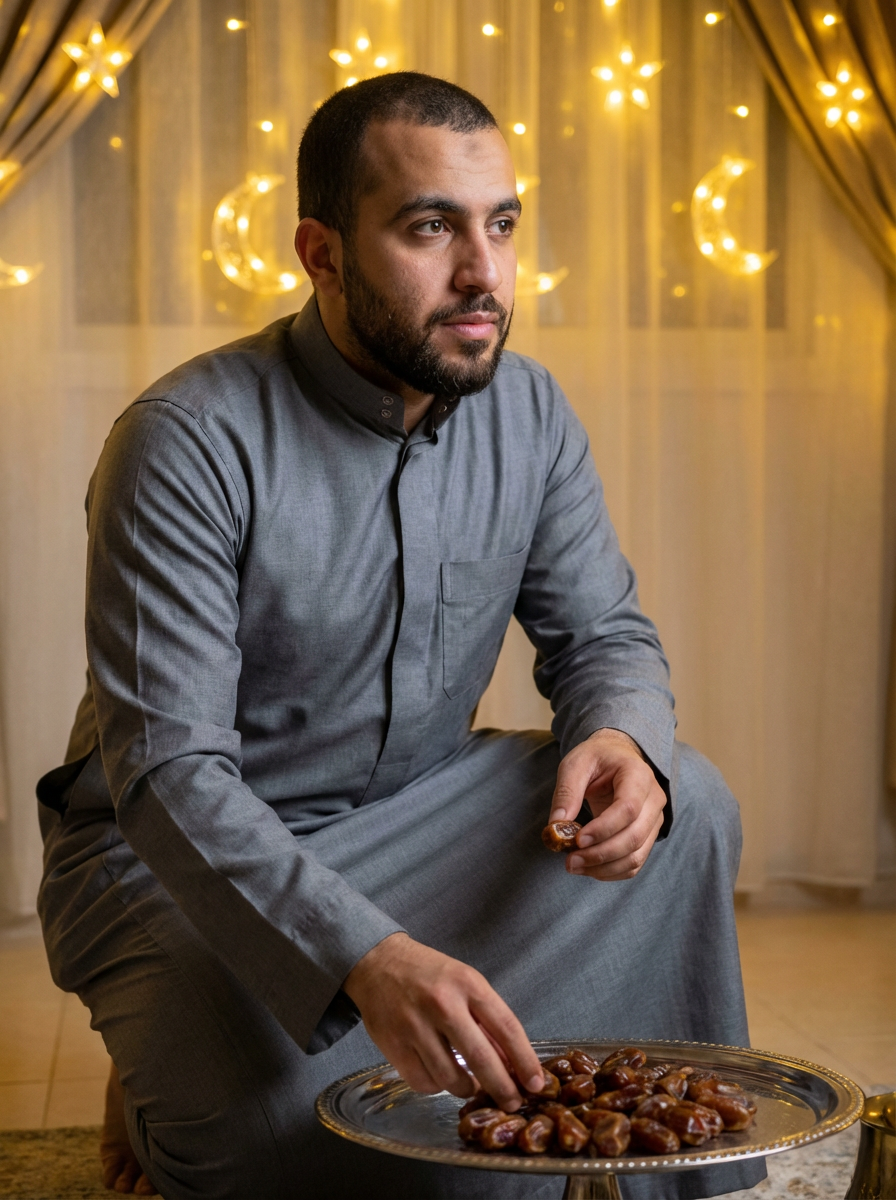a model with a contemplative look while arranging dates for iftar, adding a spiritual quality to their Ramadan observance, with soft golden lights and crescent moon decorations visible in the background