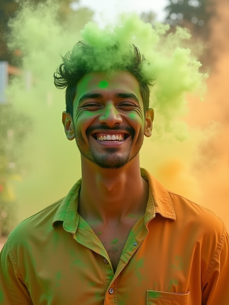 a model with a joyful expression as green and orange powders are thrown at them, adding a magical quality to their festival look, with colored powder explosions visible in the background