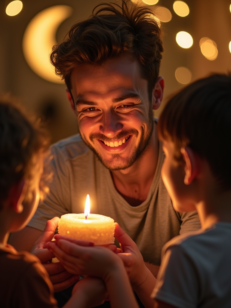 a model with a joyful look while giving Eidi to children, adding a festive quality to their Eid celebration, with soft golden lights and crescent moon decorations visible in the background