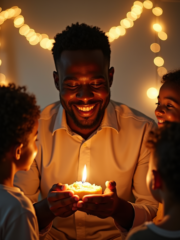 a model with a joyful look while giving Eidi to children, adding a festive quality to their Eid celebration, with soft golden lights and crescent moon decorations visible in the background