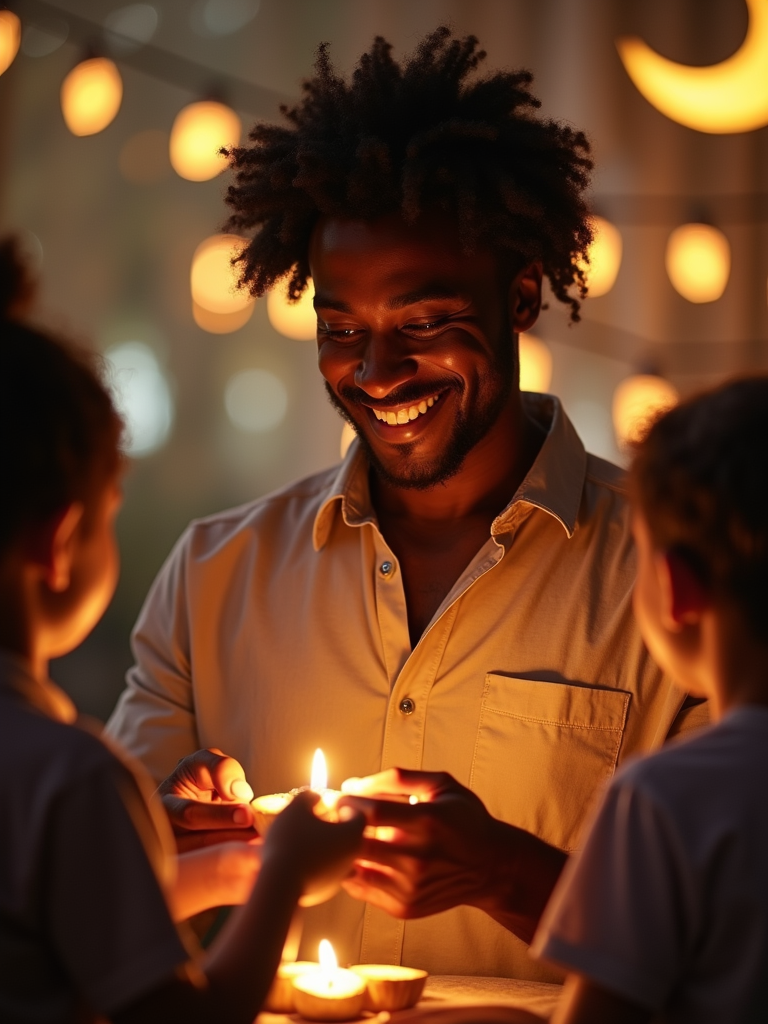 a model with a joyful look while giving Eidi to children, adding a festive quality to their Eid celebration, with soft golden lights and crescent moon decorations visible in the background