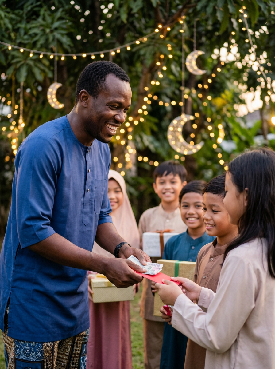 a model with a joyful look while giving Eidi to children, adding a festive quality to their Eid celebration, with soft golden lights and crescent moon decorations visible in the background