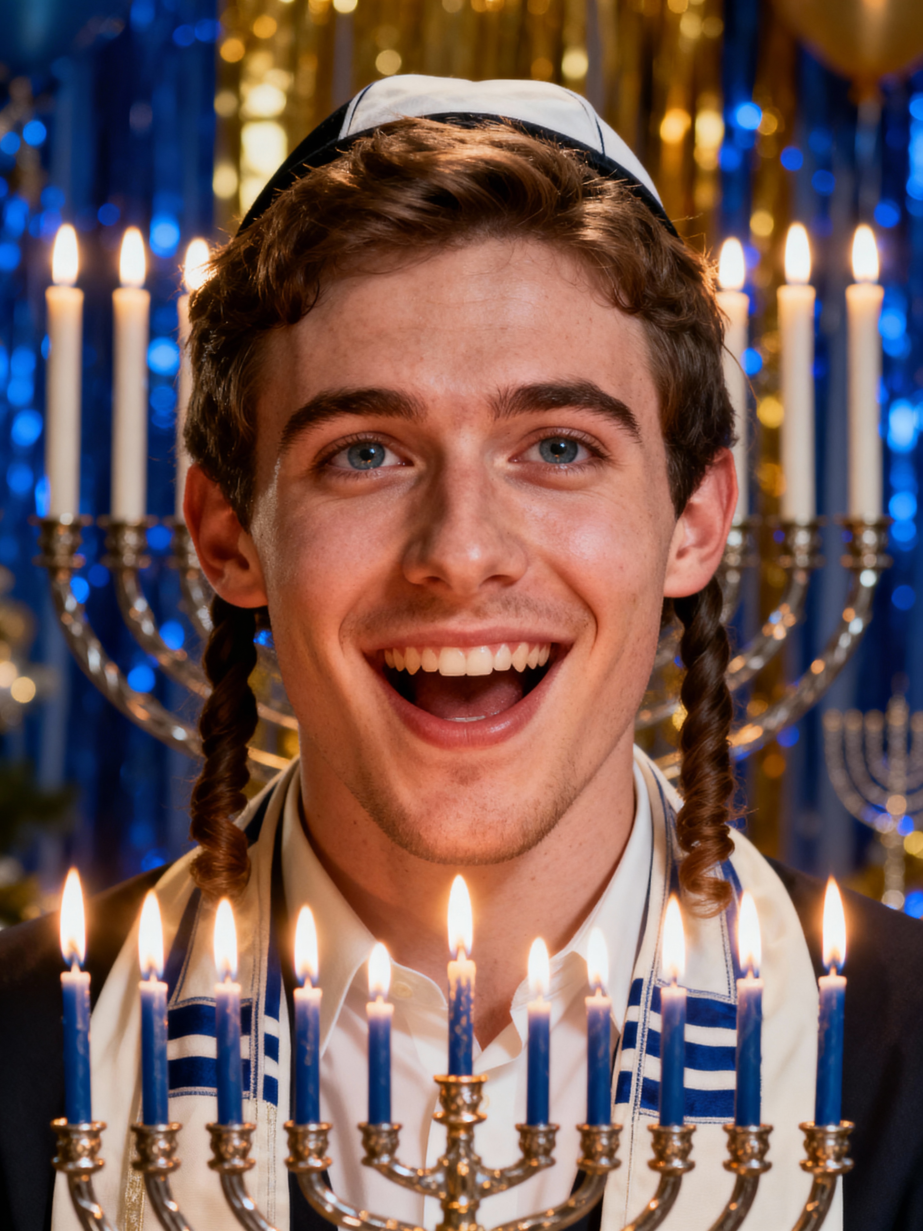 a model with a joyful look while reciting Hanukkah blessings, adding a festive quality to their celebration, with menorah lights and blue and gold decorations visible in the background