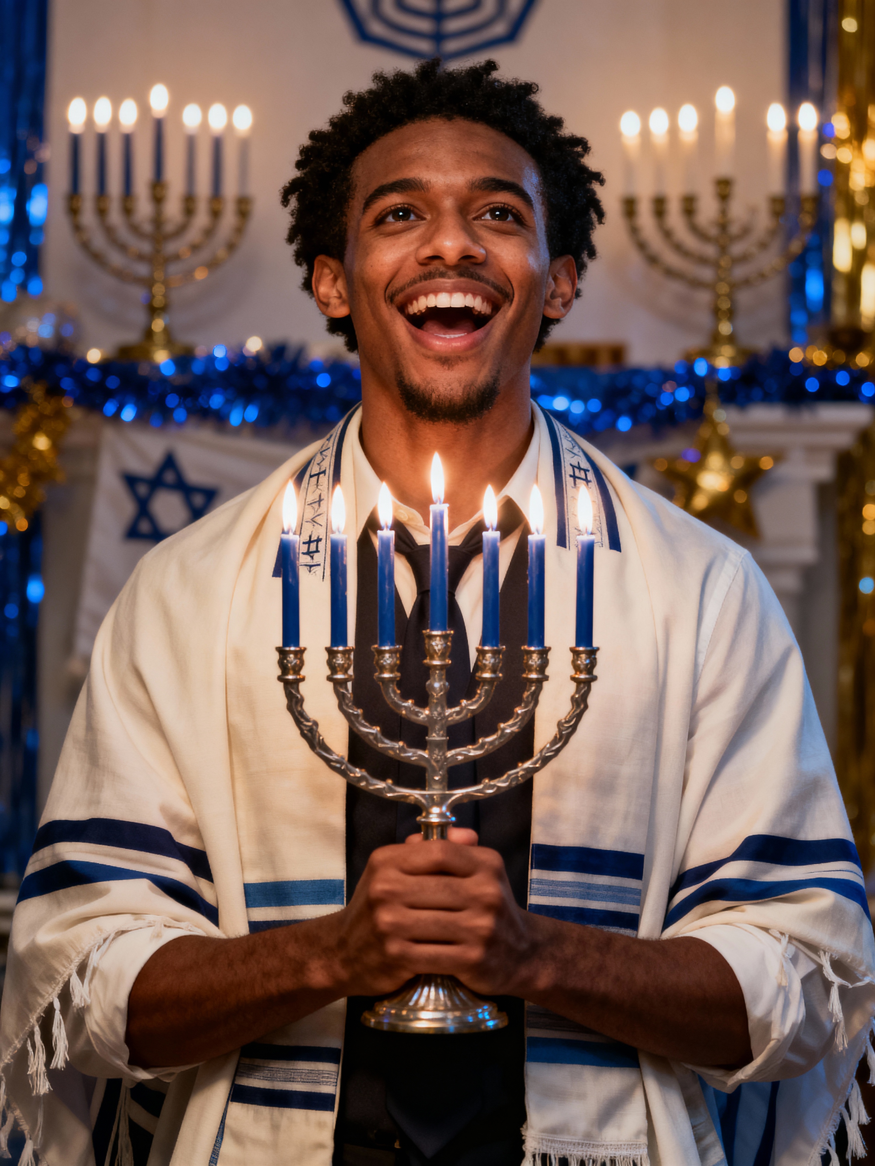 a model with a joyful look while reciting Hanukkah blessings, adding a festive quality to their celebration, with menorah lights and blue and gold decorations visible in the background