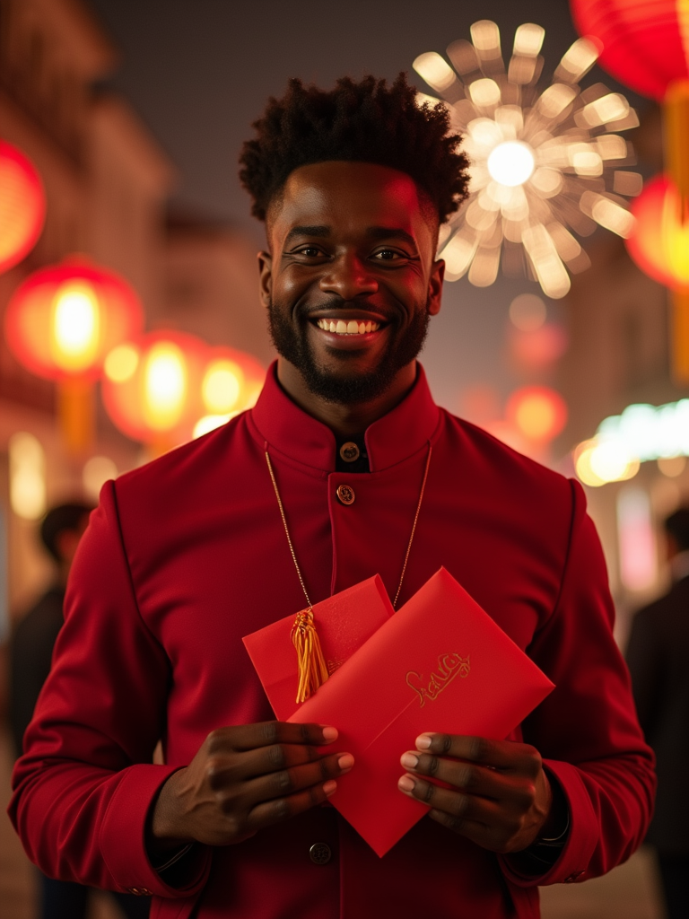 a model with a prosperous look while giving red envelopes, adding a festive quality to their celebration, with fireworks and lanterns visible in the background