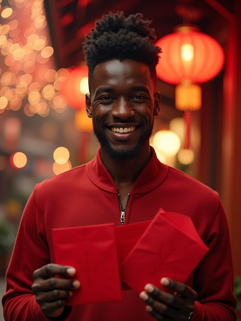 a model with a prosperous look while giving red envelopes, adding a festive quality to their celebration, with fireworks and lanterns visible in the background