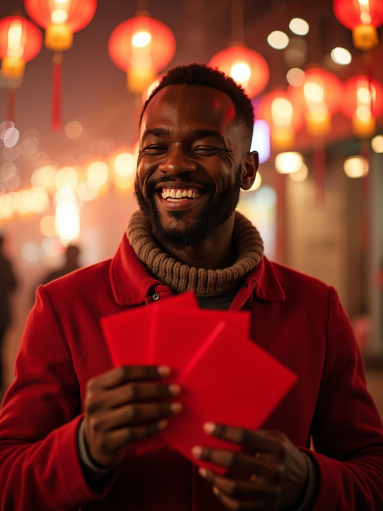 a model with a prosperous look while giving red envelopes, adding a festive quality to their celebration, with fireworks and lanterns visible in the background