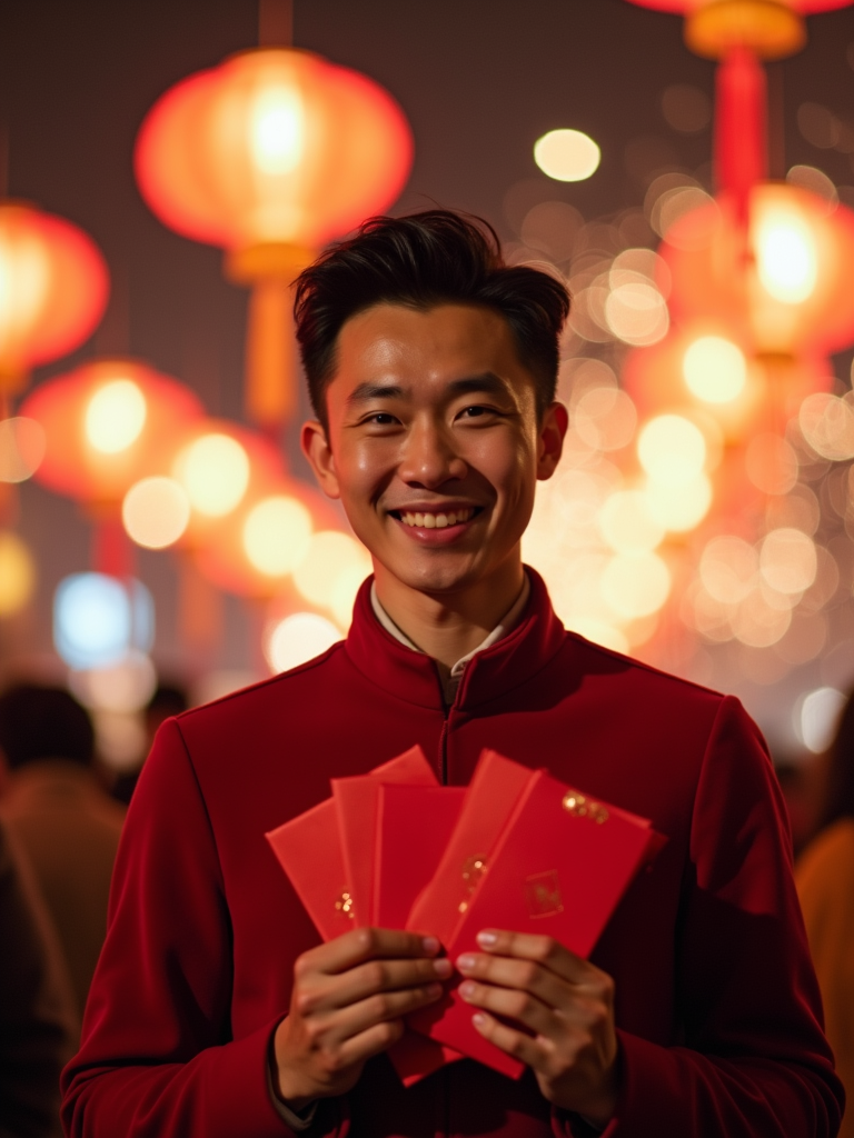 a model with a prosperous look while giving red envelopes, adding a festive quality to their celebration, with fireworks and lanterns visible in the background