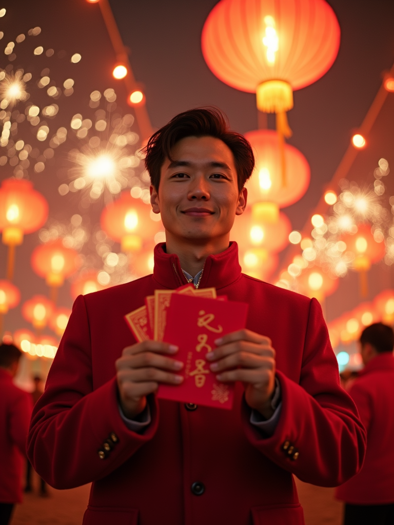 a model with a prosperous look while giving red envelopes, adding a festive quality to their celebration, with fireworks and lanterns visible in the background