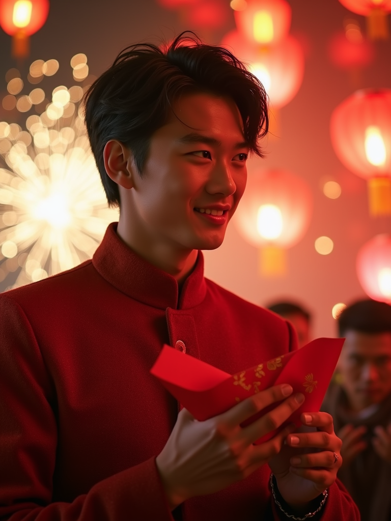 a model with a prosperous look while giving red envelopes, adding a festive quality to their celebration, with fireworks and lanterns visible in the background
