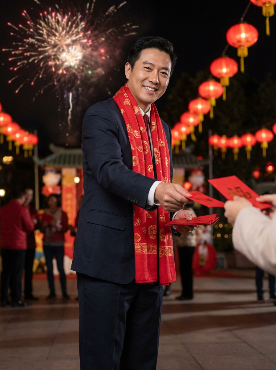 a model with a prosperous look while giving red envelopes, adding a festive quality to their celebration, with fireworks and lanterns visible in the background
