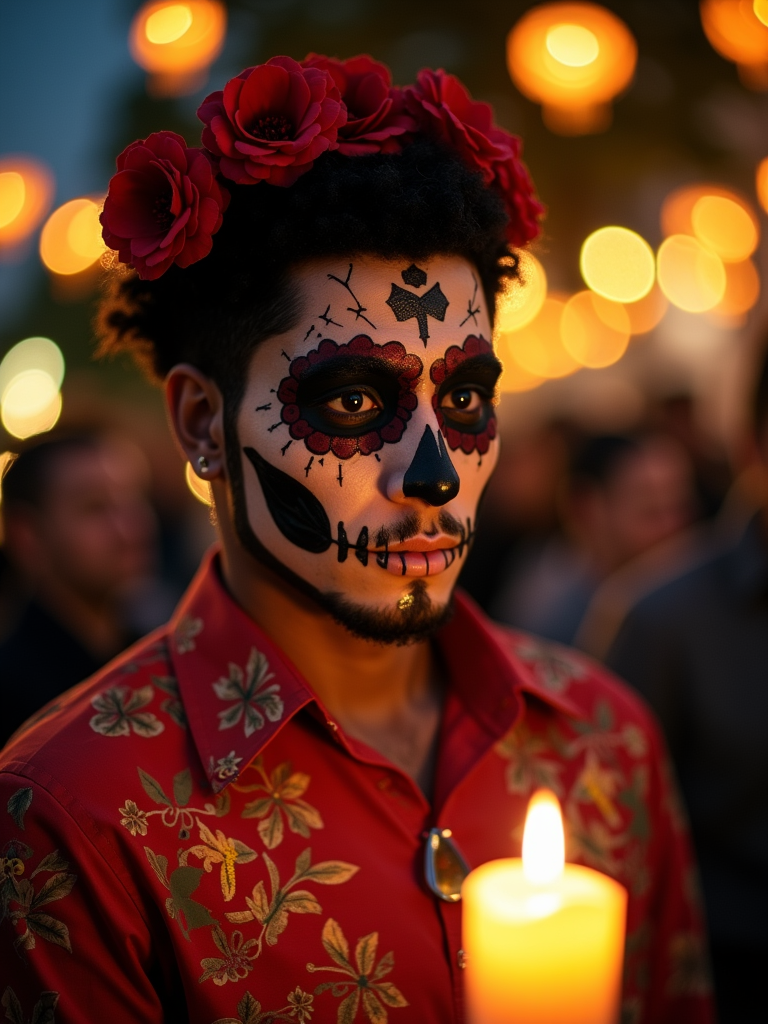a model with a respectful look while participating in a candlelight vigil, adding a meaningful quality to their celebration, with sugar skulls and papel picado visible in the background