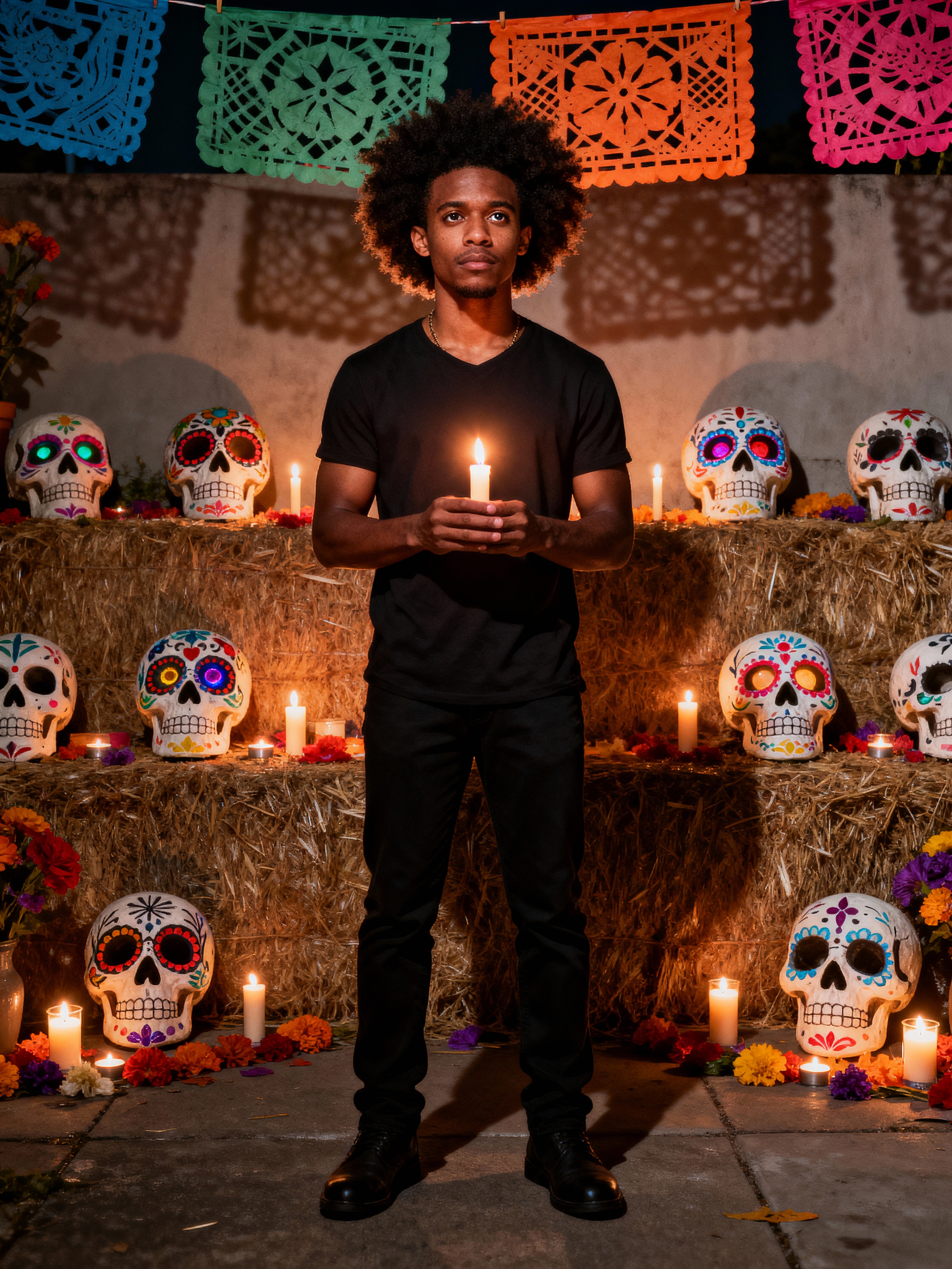a model with a respectful look while participating in a candlelight vigil, adding a meaningful quality to their celebration, with sugar skulls and papel picado visible in the background