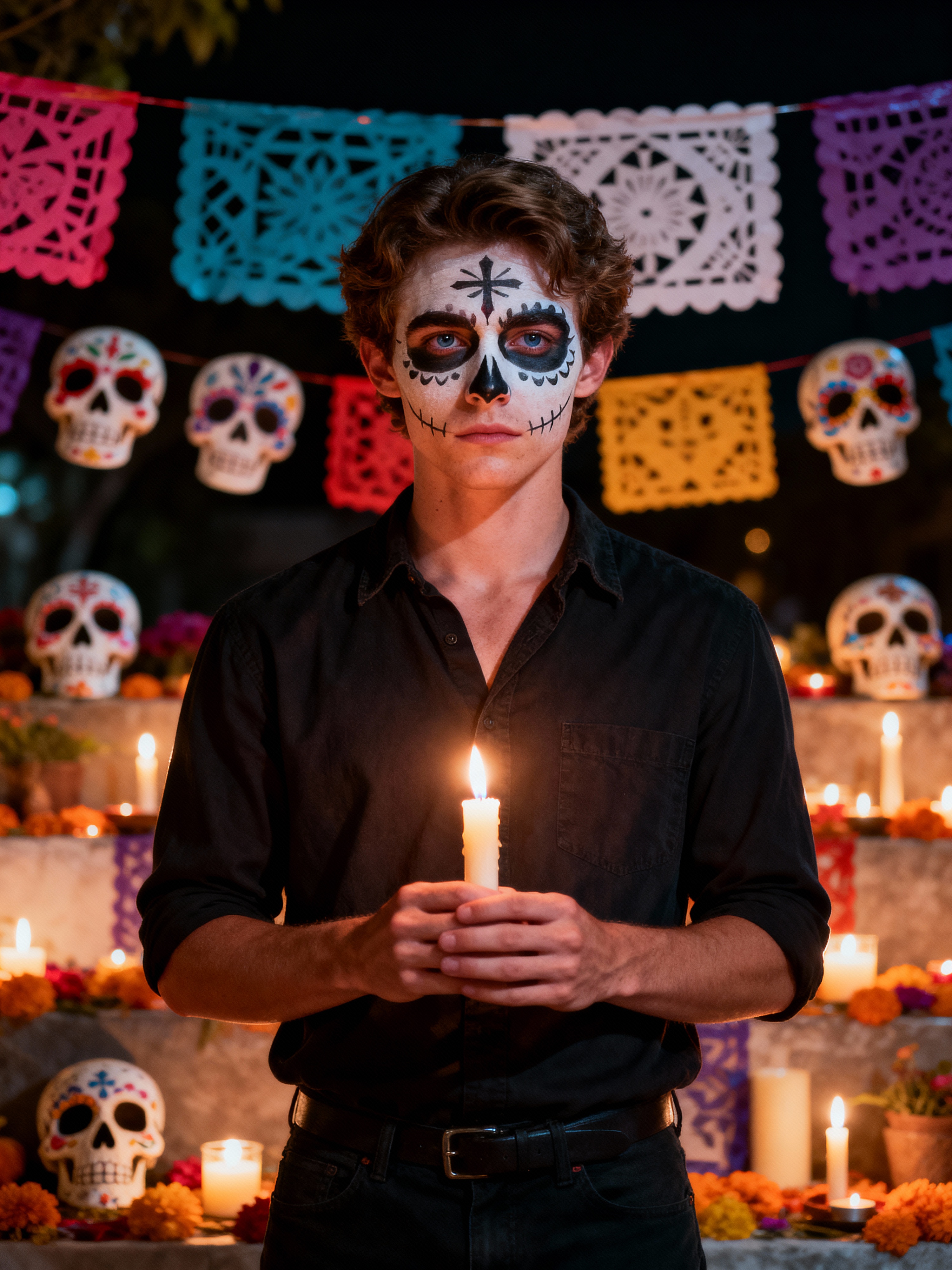 a model with a respectful look while participating in a candlelight vigil, adding a meaningful quality to their celebration, with sugar skulls and papel picado visible in the background