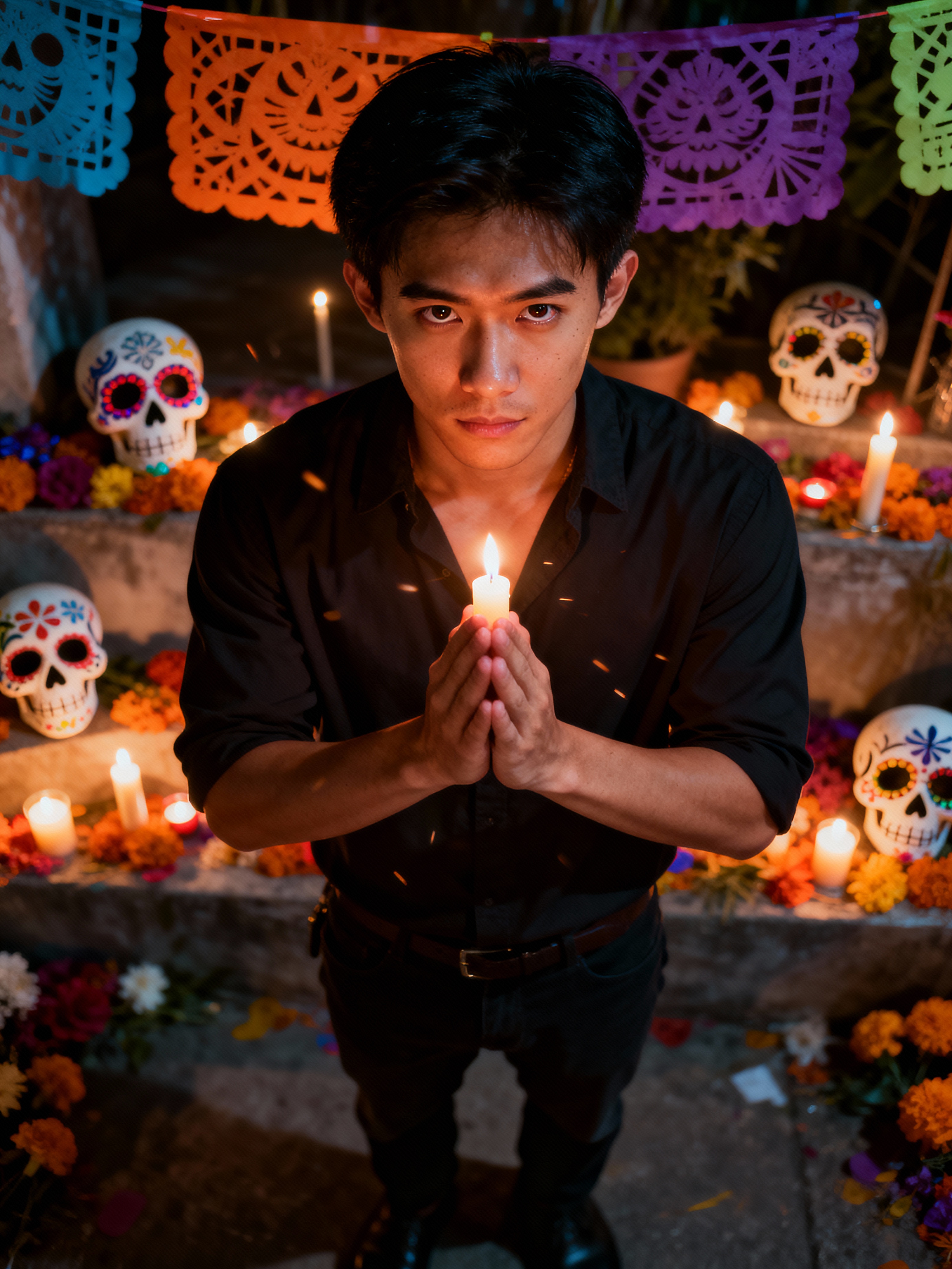 a model with a respectful look while participating in a candlelight vigil, adding a meaningful quality to their celebration, with sugar skulls and papel picado visible in the background