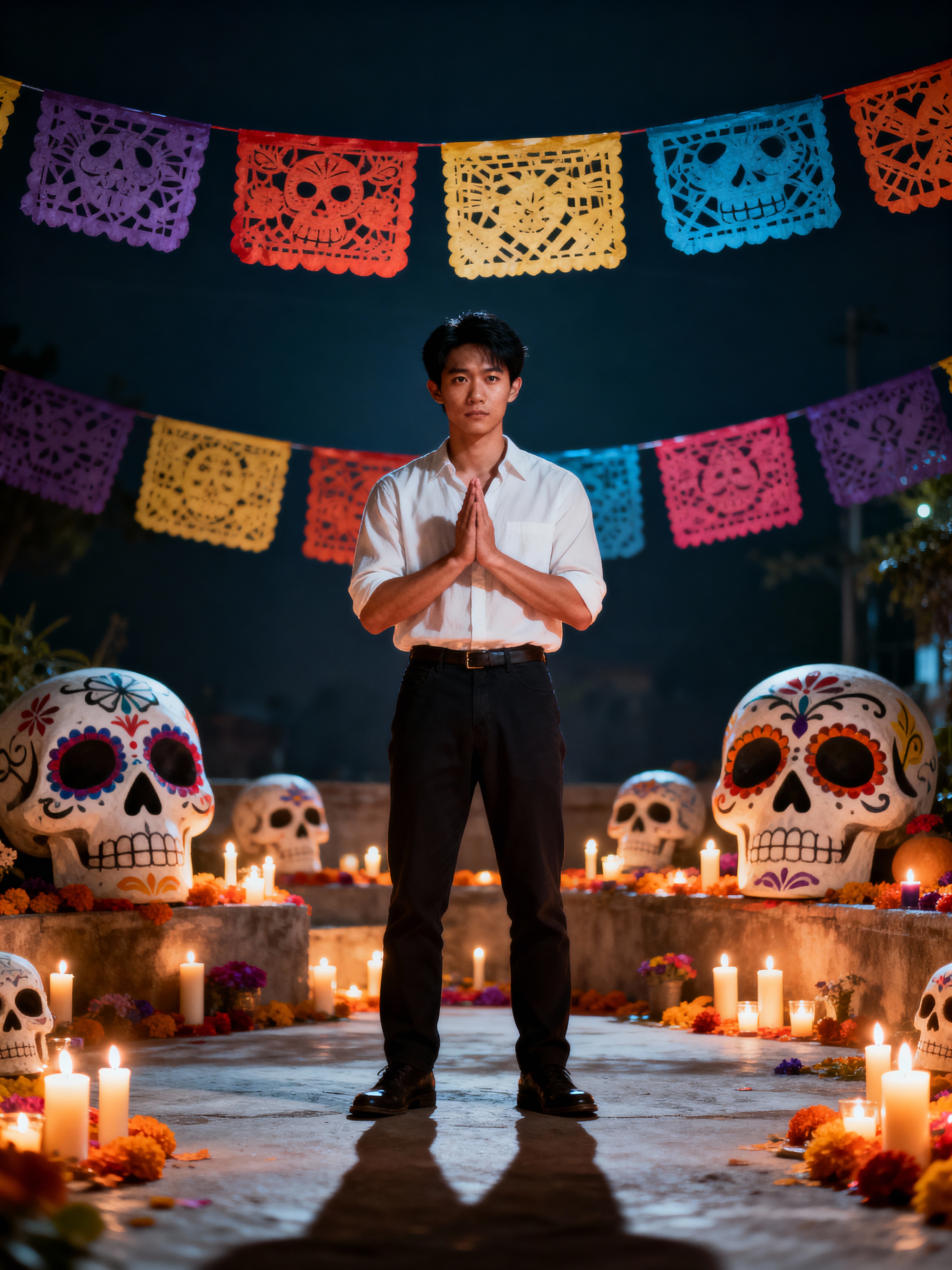 a model with a respectful look while participating in a candlelight vigil, adding a meaningful quality to their celebration, with sugar skulls and papel picado visible in the background