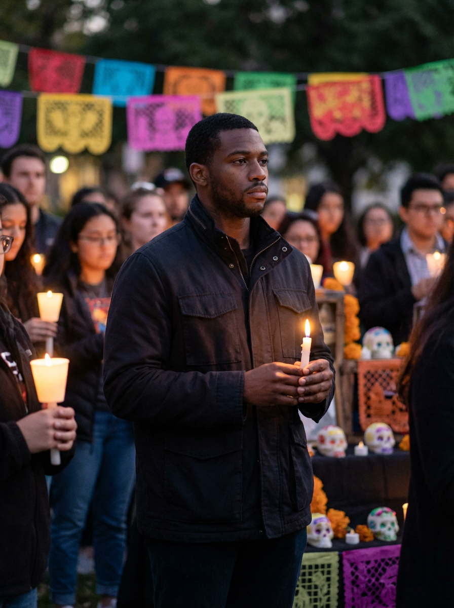 a model with a respectful look while participating in a candlelight vigil, adding a meaningful quality to their celebration, with sugar skulls and papel picado visible in the background