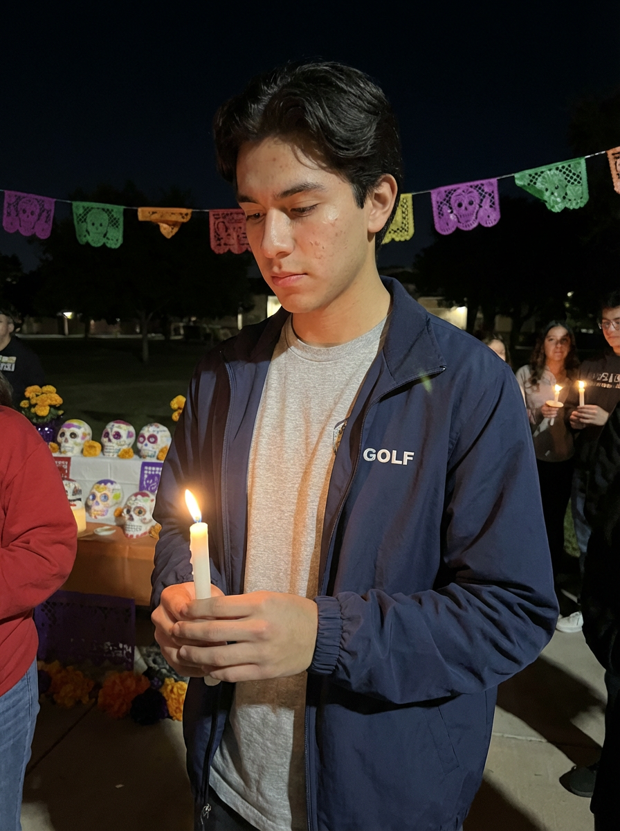 a model with a respectful look while participating in a candlelight vigil, adding a meaningful quality to their celebration, with sugar skulls and papel picado visible in the background