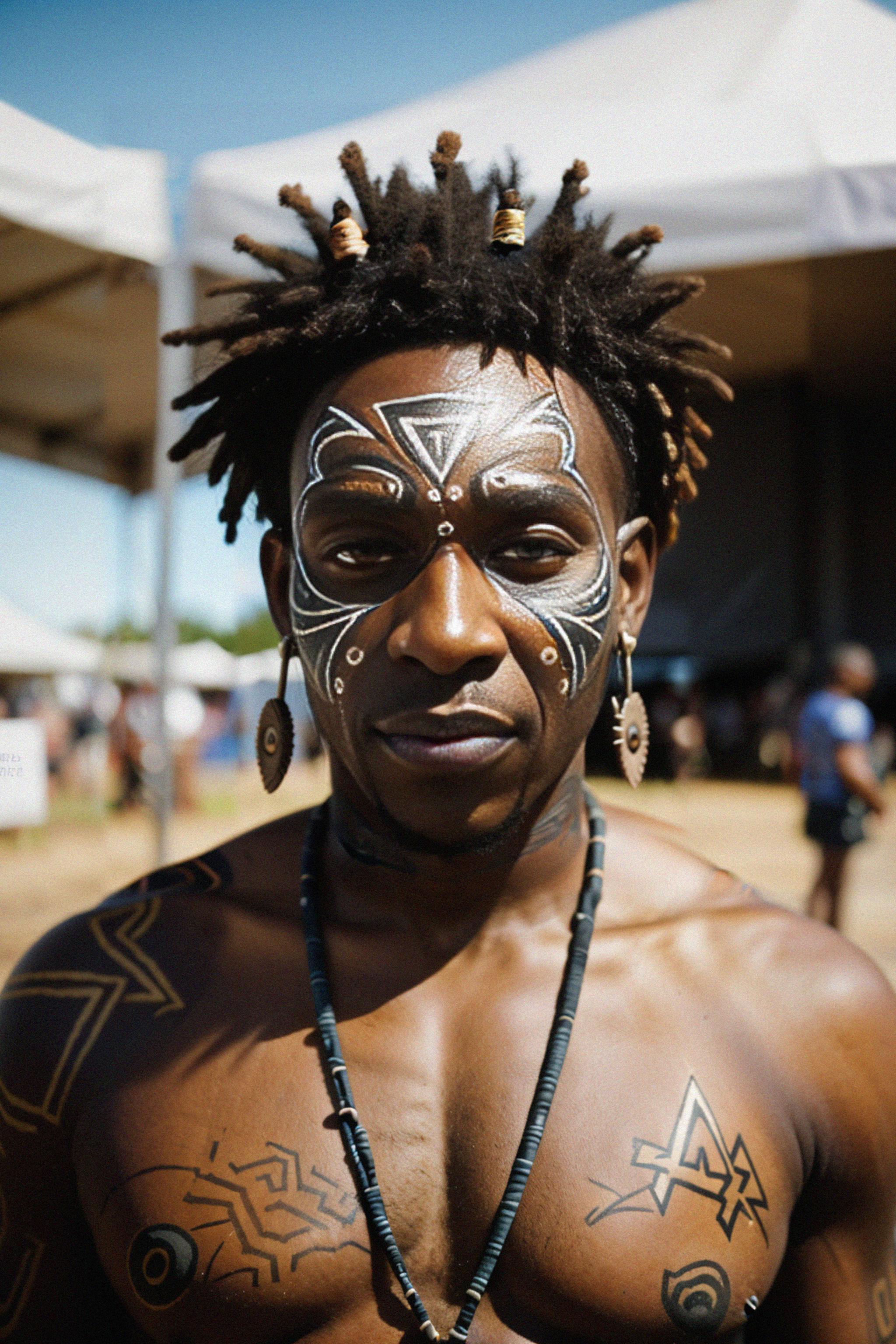 a model with a tribal face paint design, adding an element of tribal and cultural inspiration to their festival look