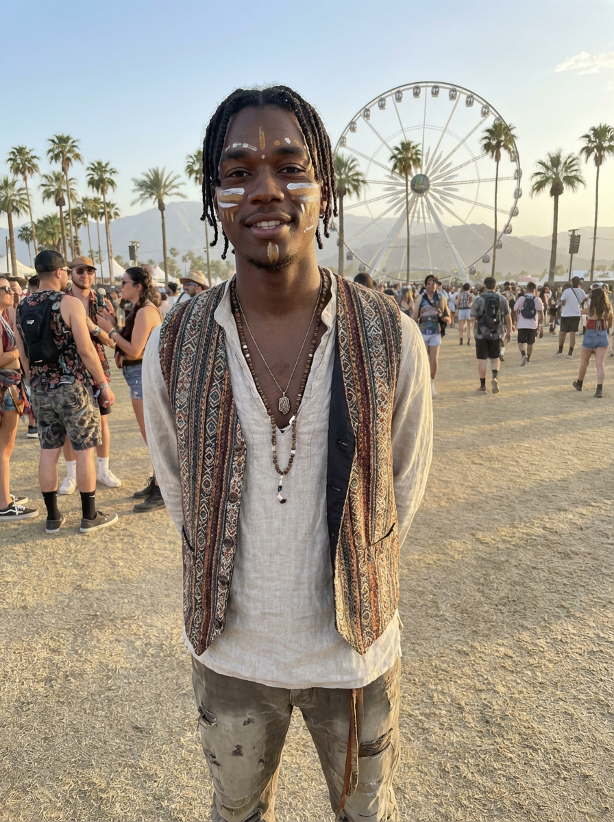 a model with a tribal face paint design, adding bohemian flair to their Coachella look, with the iconic festival grounds visible in the background