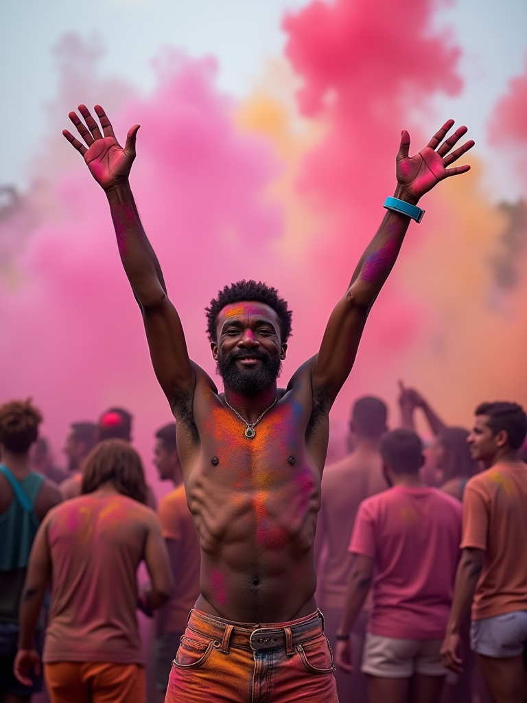 a model with arms raised in celebration covered in colorful powders, standing out in the festival crowd with vibrant color clouds surrounding them