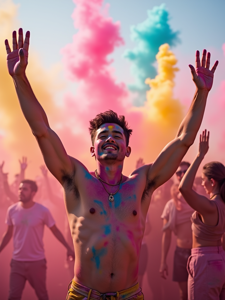 a model with arms raised in celebration covered in colorful powders, standing out in the festival crowd with vibrant color clouds surrounding them