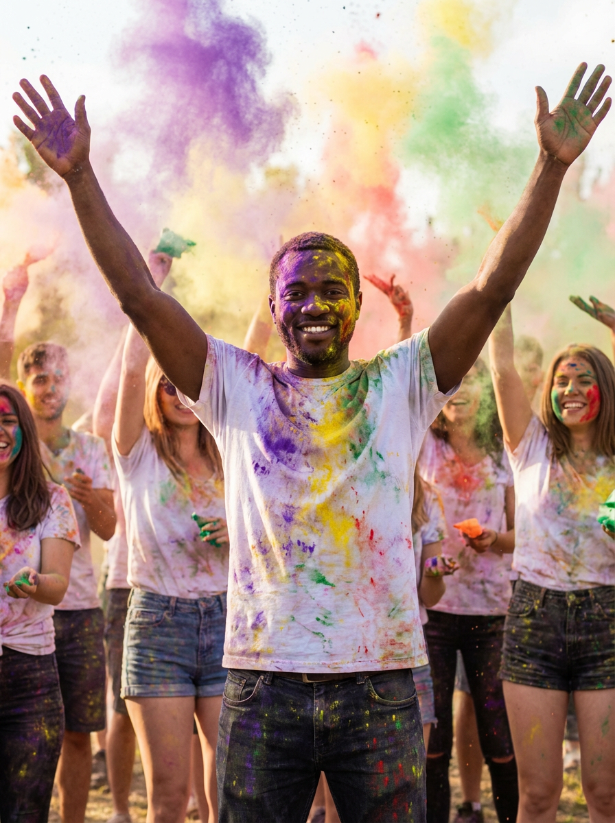 a model with arms raised in celebration covered in colorful powders, standing out in the festival crowd with vibrant color clouds surrounding them