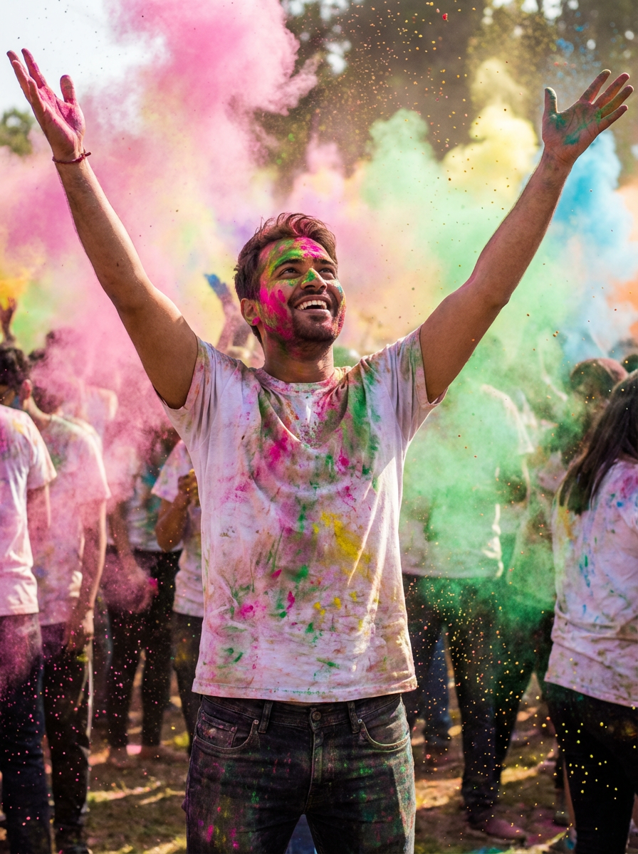 a model with arms raised in celebration covered in colorful powders, standing out in the festival crowd with vibrant color clouds surrounding them