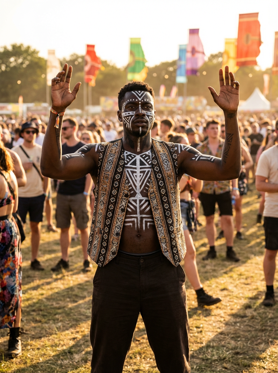 a model with bold face and body art, capturing the artistic and expressive side of the music festival experience