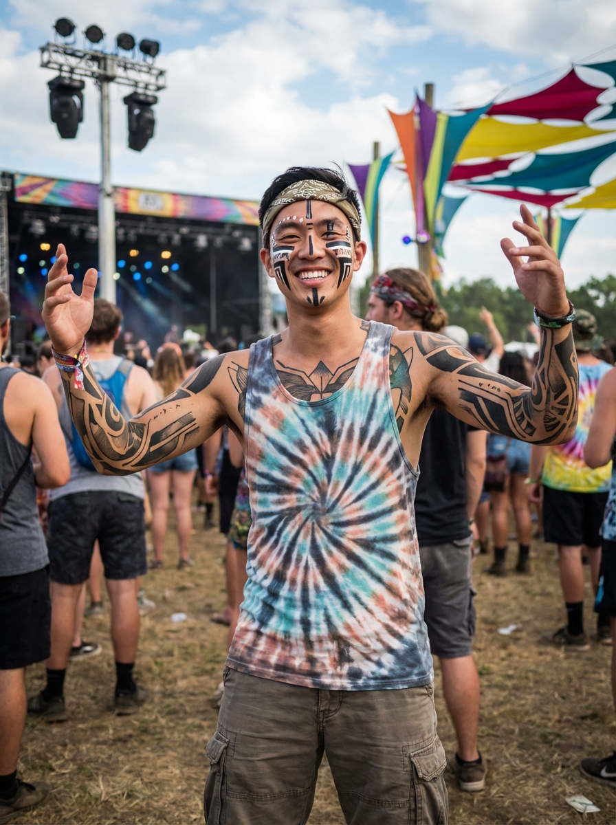 a model with bold face and body art, capturing the artistic and expressive side of the music festival experience