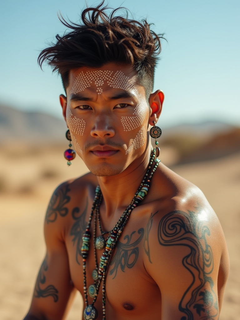 a model with bold face and body art, capturing the artistic expression that defines Coachella, with desert landscape in the background