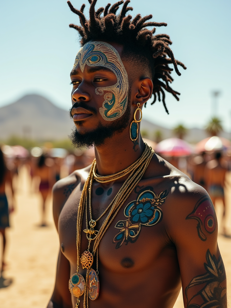 a model with bold face and body art, capturing the artistic expression that defines Coachella, with desert landscape in the background
