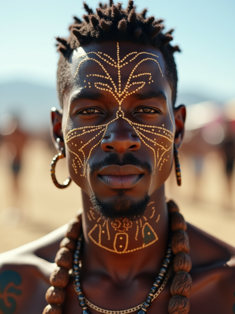a model with bold face and body art, capturing the artistic expression that defines Coachella, with desert landscape in the background