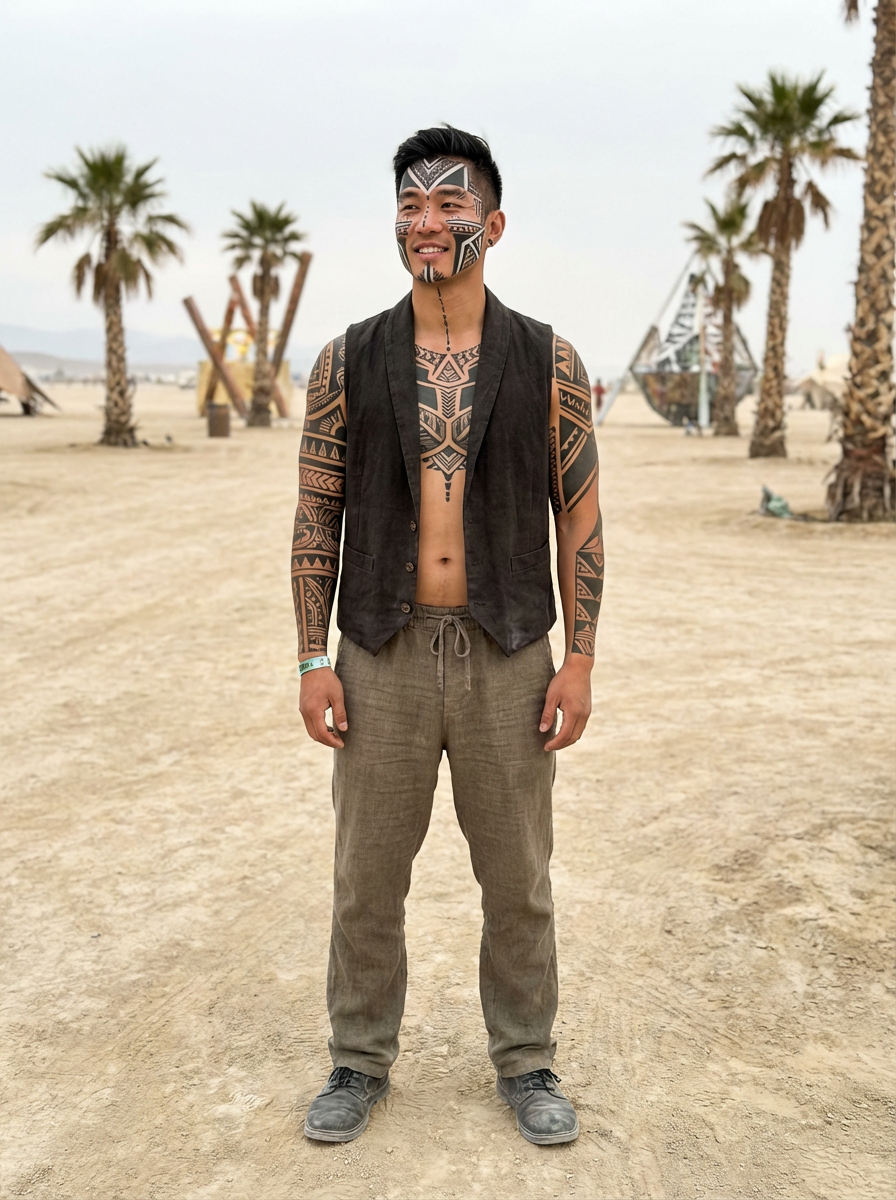 a model with bold face and body art, capturing the artistic expression that defines Coachella, with desert landscape in the background