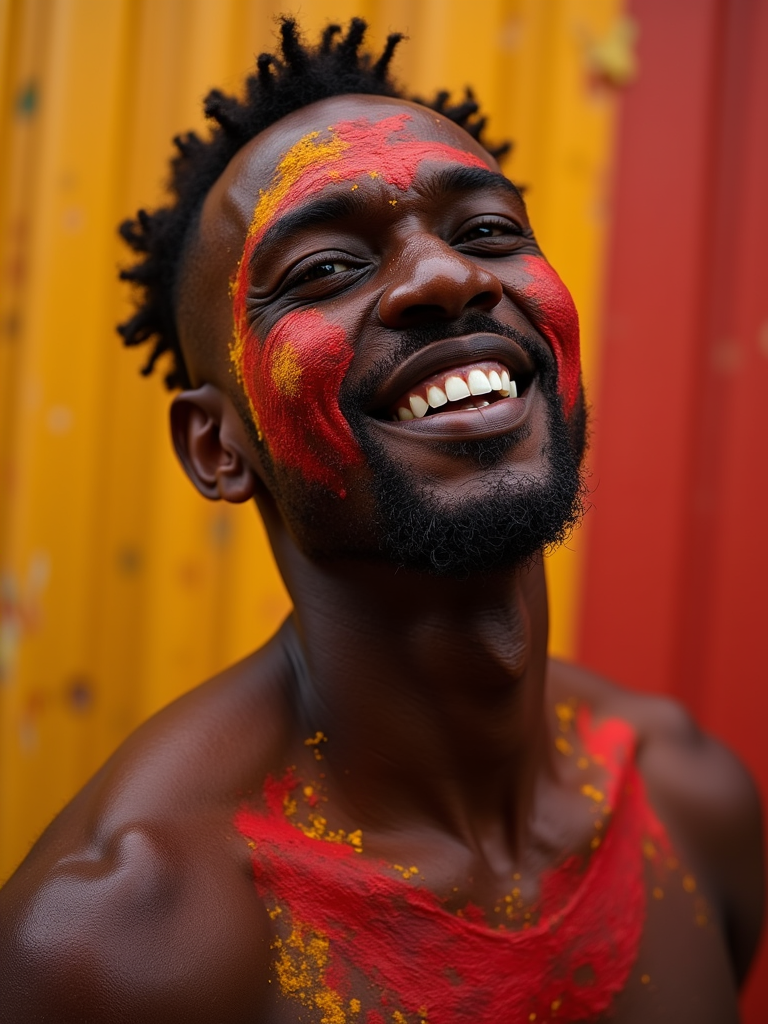 a model with face and chest decorated with red and yellow festival colors, capturing the artistic expression that defines this ancient celebration