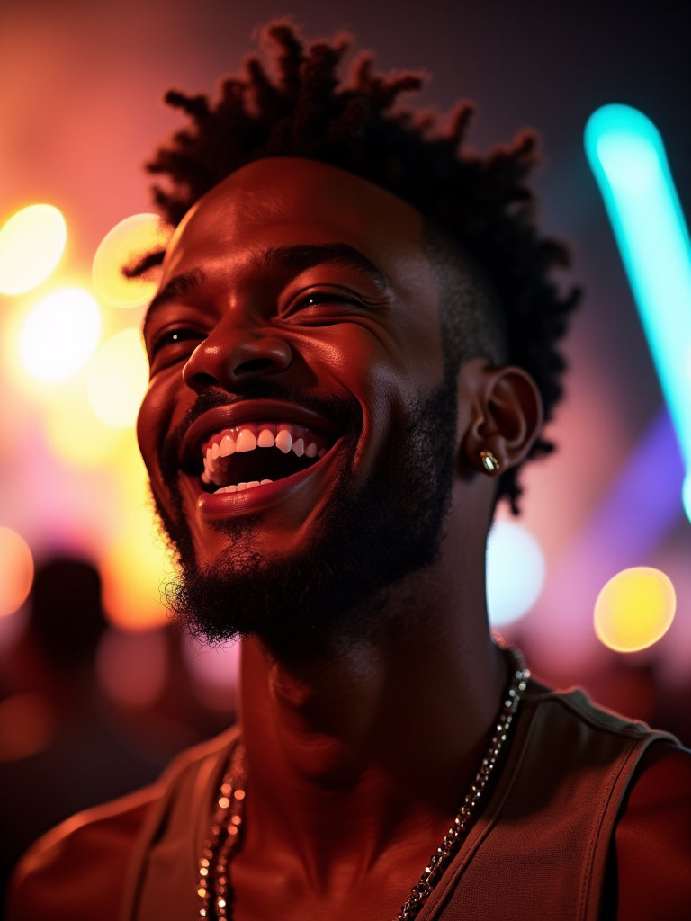 a model with face with a joyful expression amid festival lights, capturing the excitement that defines this important cultural celebration