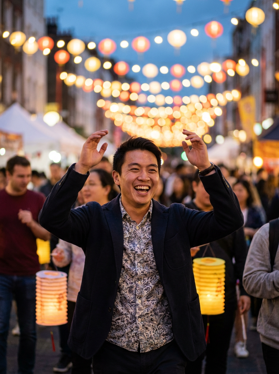 a model with face with a joyful expression amid festival lights, capturing the excitement that defines this important cultural celebration