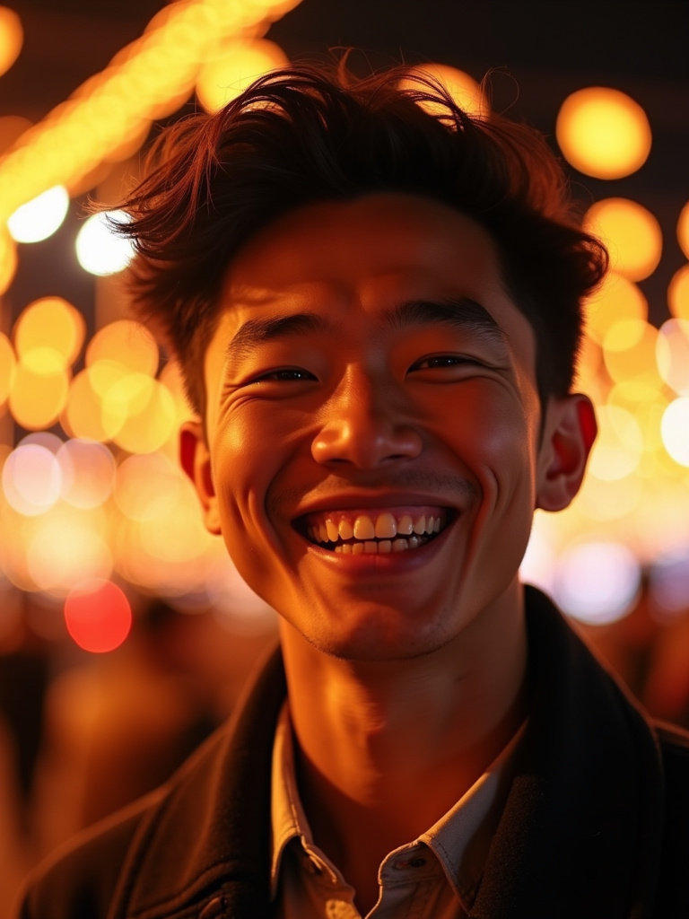 a model with face with a joyful expression amid festival lights, capturing the miracle of light that defines this important holiday