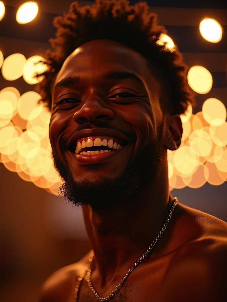 a model with face with a joyful expression in the glow of Eid lights, capturing the happiness that defines this blessed holiday