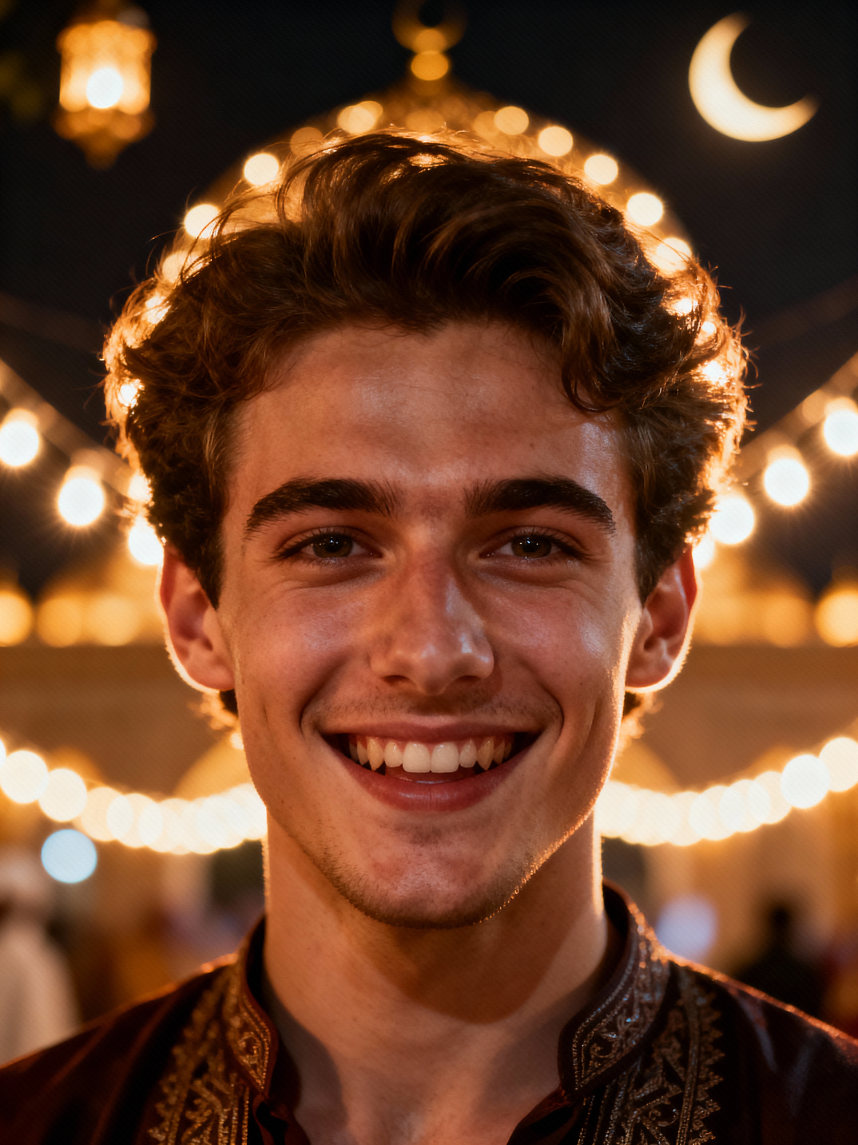a model with face with a joyful expression in the glow of Eid lights, capturing the happiness that defines this blessed holiday