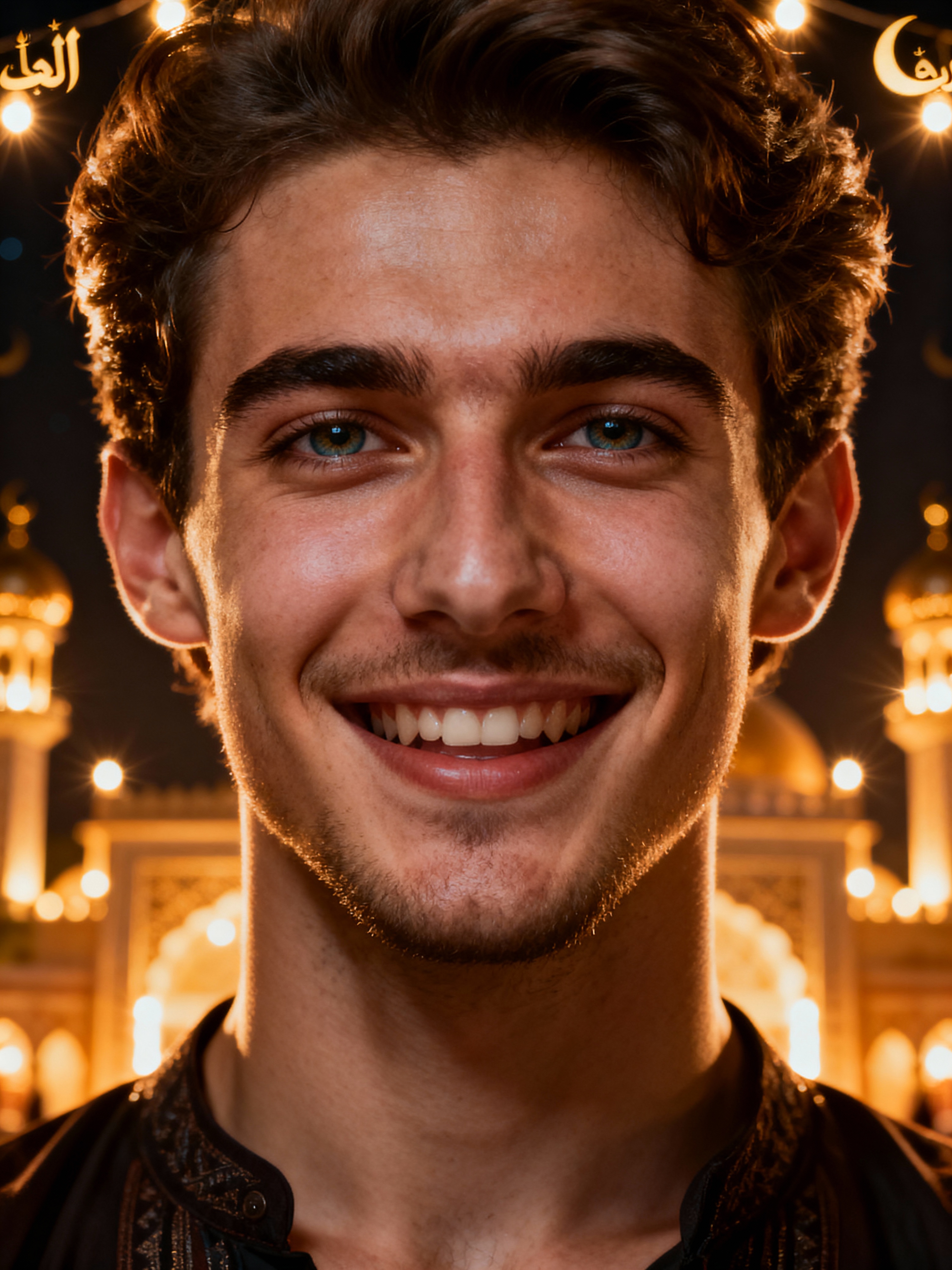 a model with face with a joyful expression in the glow of Eid lights, capturing the happiness that defines this blessed holiday